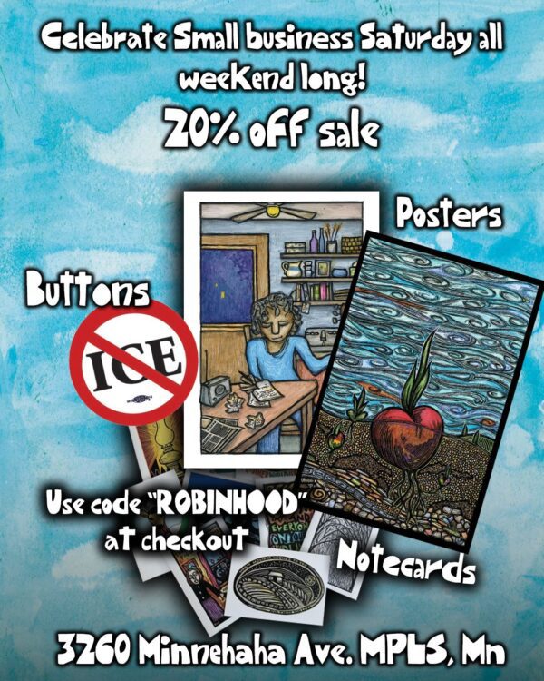 This site features artwork I’ve created over years to encourage the laughter, hope, love and anger that move us toward a better world. Many were made for and within the labor, environmental and social justice movements of our time. They can be gifts, educational materials, morale boosters, appreciation awards, organizing tools, courtship displays and many other communication purposes. Most posters are 11″x17″ but some are larger format. Many pieces are on button pins or note cards too, as well as shirts, puzzles, and in other formats. We ship anywhere the US Post Office does.